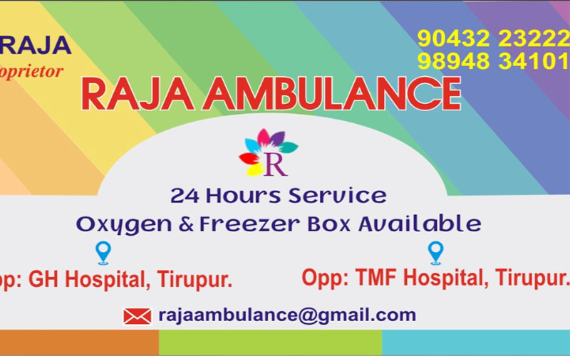 RAJA AMBULANCE Service is one of the best Emergency Ambulance Services in Tirupur. Raja Ambulance was started on XXX. We are located in Opposite to GH Hospital and TMF Hospital in Tirupur. Accident and Emergency care is a 24-hour fully-equipped medical centre which caters to all kinds of accident victims and emergency cases. It has the top level urgent and ICU services for the serious patients.